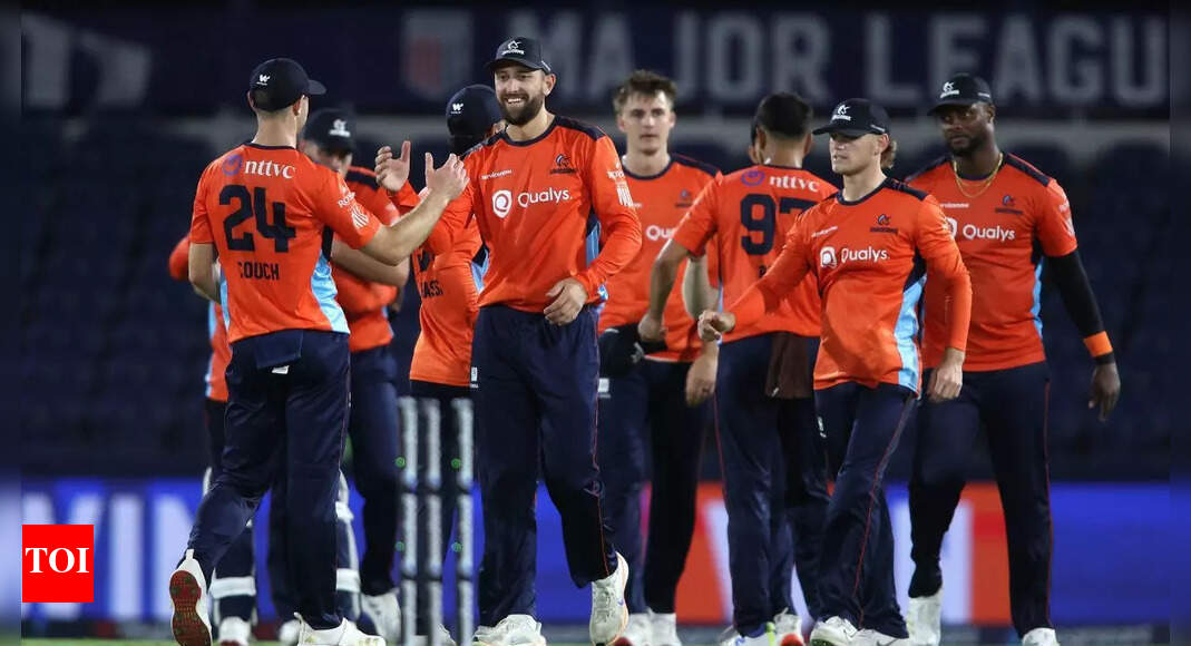 San Francisco Unicorns players celebrate beating Seattle Orcas by 32 runs during match 16 of the Cognizant Major League Cricket…