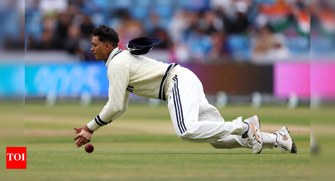 LEEDS, ENGLAND – JUNE 24: Yashasvi Jaiswal of India drops a catch during Day Five of the 1st Rothesay Test…