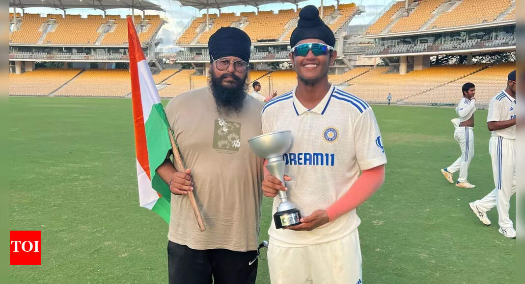Harvansh Singh with his father. (Image: Special Arrangement) India U-19 wicketkeeper-batter Harvansh Singh Pangalia on Tuesday scored an whirlwind century…