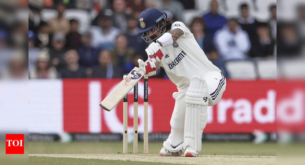 India’s KL Rahul bats on day four of the first cricket test match between England and India at Headingley in…