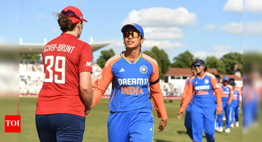 Nat Sciver-Brunt of England shakes hands with Smriti Mandhana after India won the 1st Women’s IT20 (Image by Philip Brown/Getty…