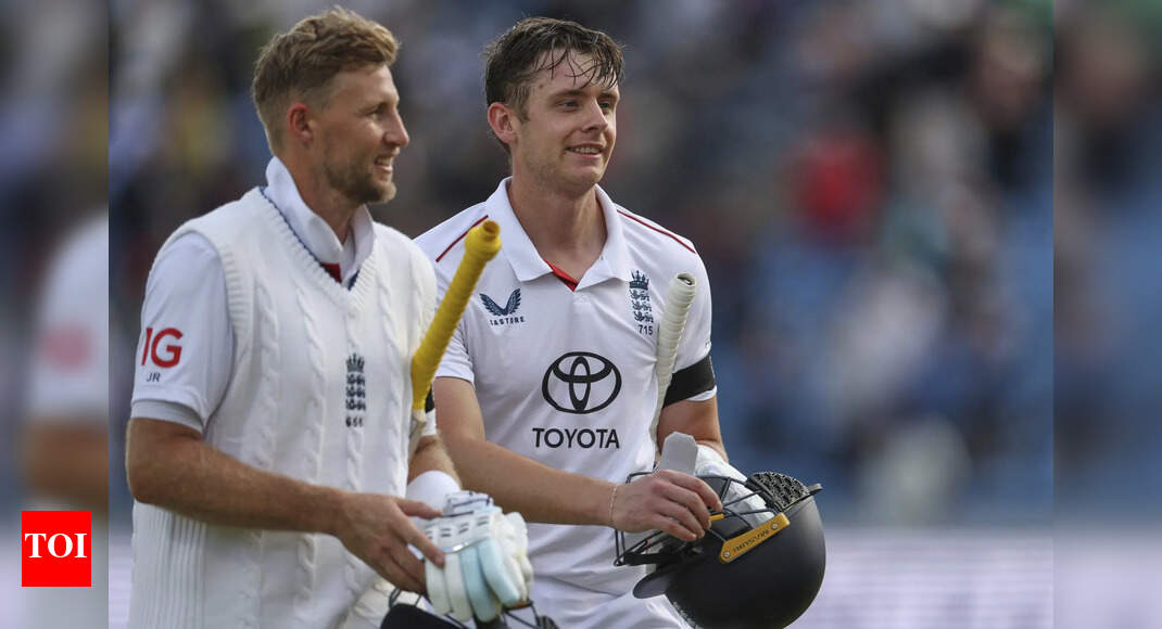 England’s Joe Root, left, and batting partner Jamie Smith leave the field after their win on day five of the…