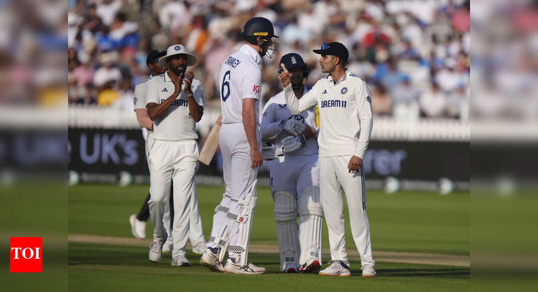 India’s Shubman Gill and England’s Zak Crawley have words at the end of the third day during the third cricket…