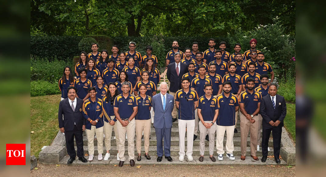 LONDON, ENGLAND – JULY 15: King Charles III poses for a photo with members of the India men’s and women’s…