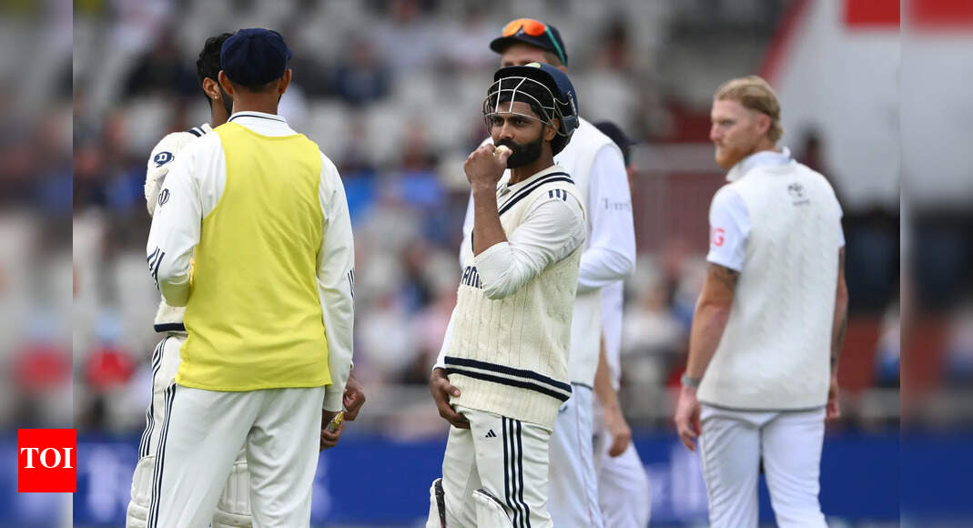 India batters Ravindra Jadeja eats a banana as England captain Ben Stokes walks away (Photo by Stu Forster/Getty Images) The…