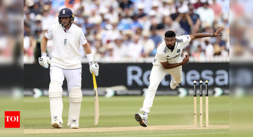 India’s Mohammed Siraj, right, bowls a delivery during the fourth day of the third cricket test match between England and…