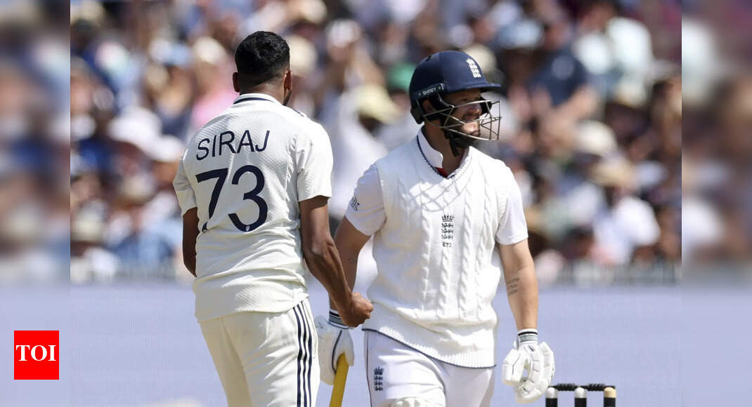 India’s Mohammed Siraj, left, celebrates the dismissal of England’s Ben Duckett, right, during the fourth day of the third cricket…