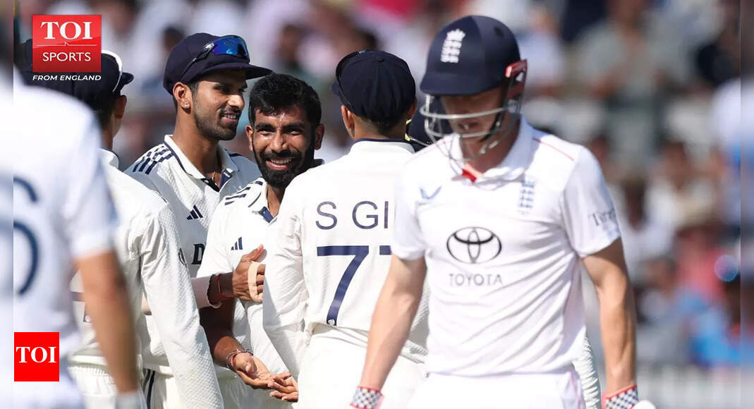 Jasprit Bumrah celebrates with teammates after taking the wicket of Harry Brook. (Pic credit: BCCI) TimesofIndia.com in London: You knew…
