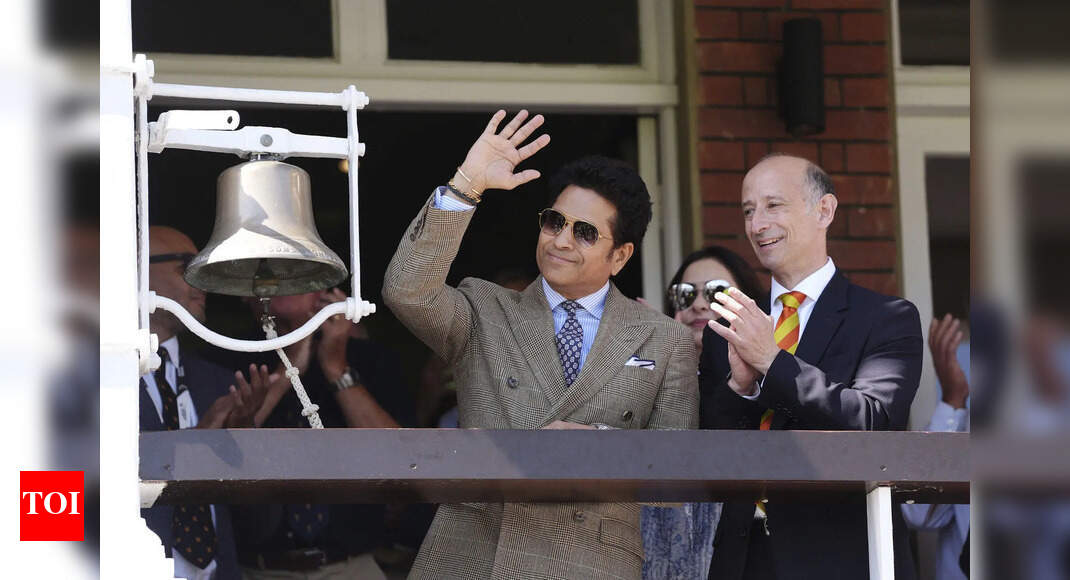 Sachin Tendulkar, center, rings the five minute bell during day one of the Third Rothesay Men’s Test at Lord’s, London,…