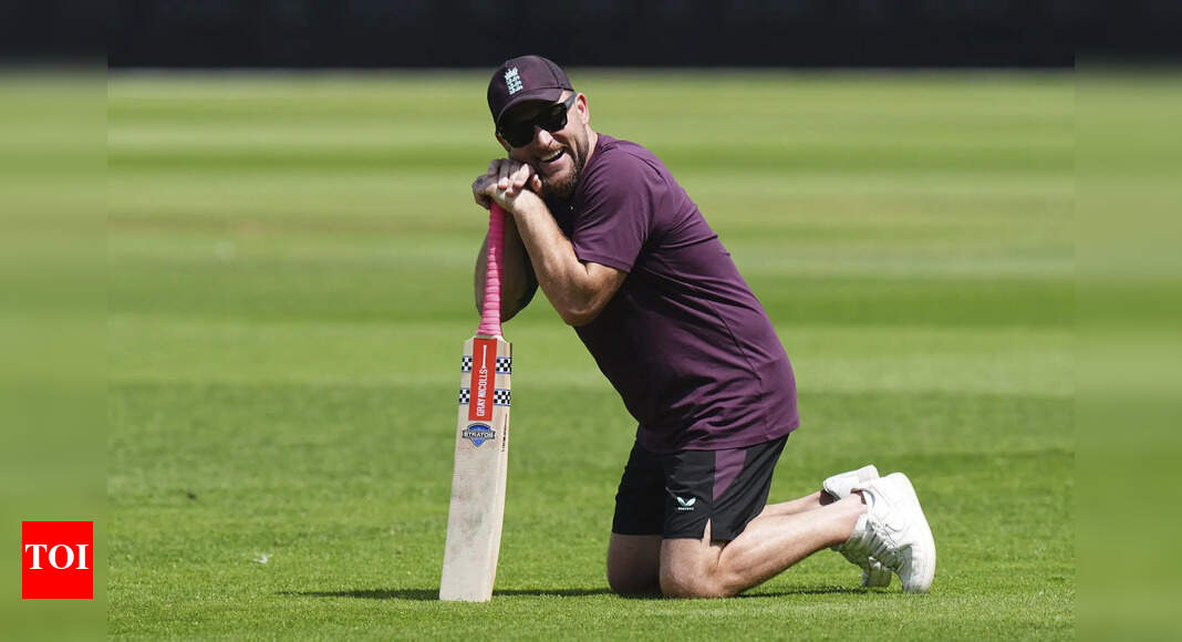 England’s head coach Brendon McCullum during a nets session in Birmingham, England, Monday, June 30, 2025. (Jacob King/PA via AP)…