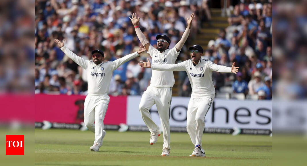 India’s captain Shubman Gill, right, along with teammates appeal to the umpire during day four of the second cricket test…