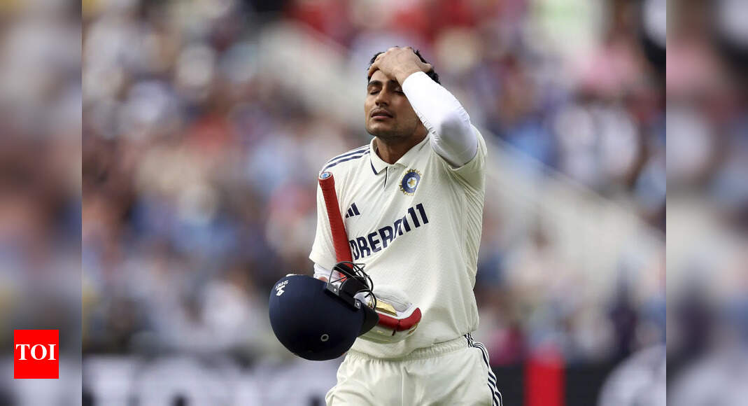 India’s captain Shubman Gill reacts after being caught during day four of the second cricket test match between England and…