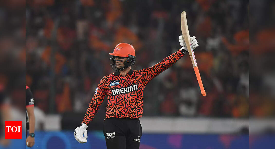 Abhishek Sharma of SRH celebrates after his century during the 2025 IPL match against Punjab Kings on April 12, 2025…