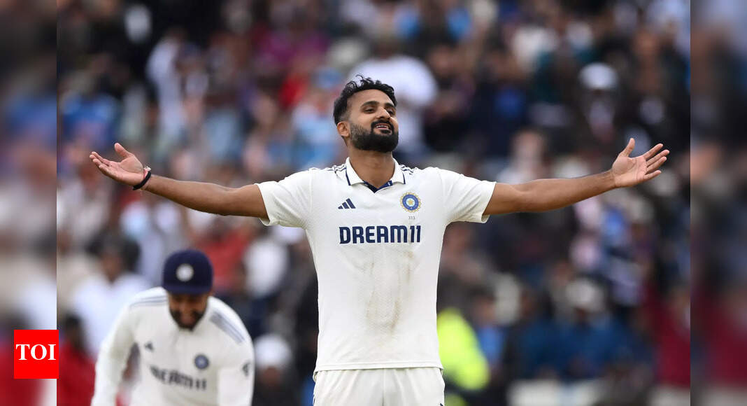 Akash Deep celebrates after taking the final wicket of Brydon Carse to take his 10th wicket of the match and…
