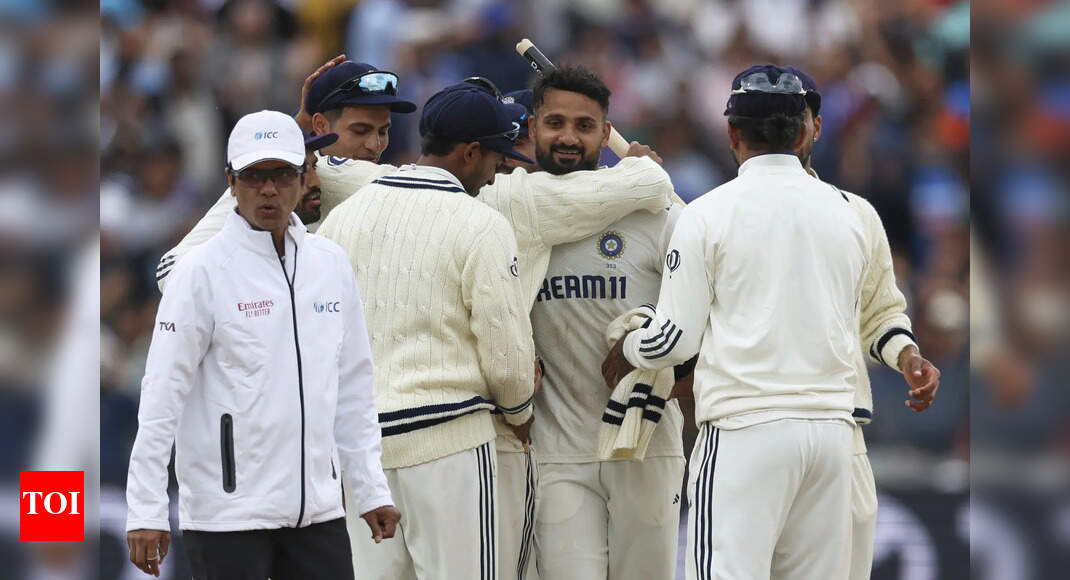 India’s Akash Deep, center, celebrates with teammates after their win against England on day five of the second cricket test…