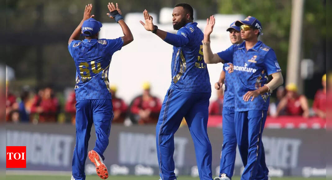 Kieron Pollard of MI New York is congratulated for getting the wicket of Sherfane Rutherford of Los Angeles Knight Riders…