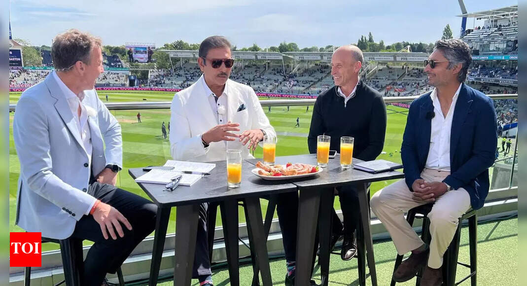 L-R: Mike Atherton, Ravi Shastri, Nasser Hussain, Kumar Sangakkara (Pic credit: Shastri’s X post) As the action on the field…