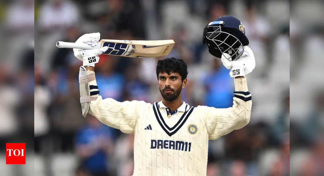 MANCHESTER, ENGLAND – JULY 27: India batsman Washington Sundar celebrates his century during day five of the 4th Test Match…
