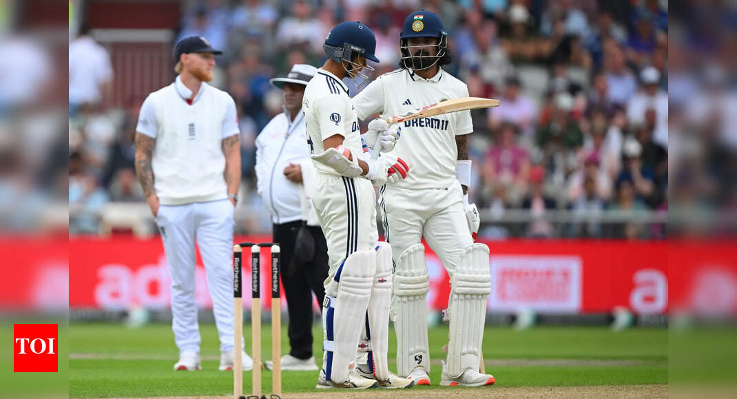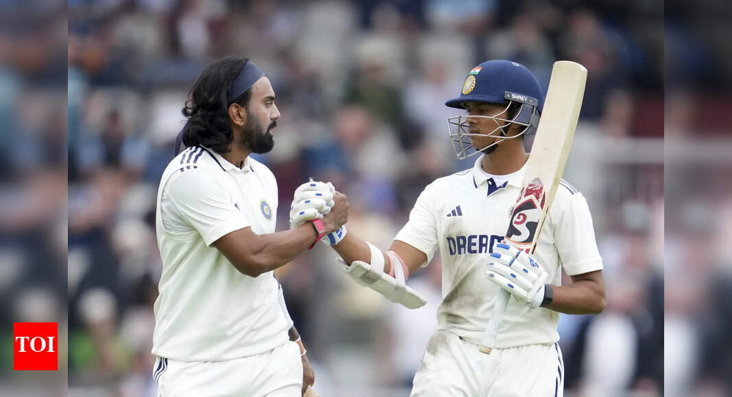 MANCHESTER, ENGLAND – JULY 23: Yashasvi Jaiswal of India shows his broken bat to opening partner KL Rahul during Day…