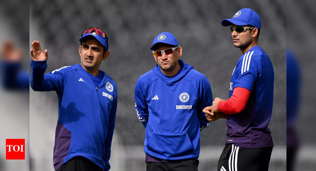 India captain Shubman Gill speaks with coach Gautam Gambhir and selector Ajit Agarkar during a net session at Emirates Old…