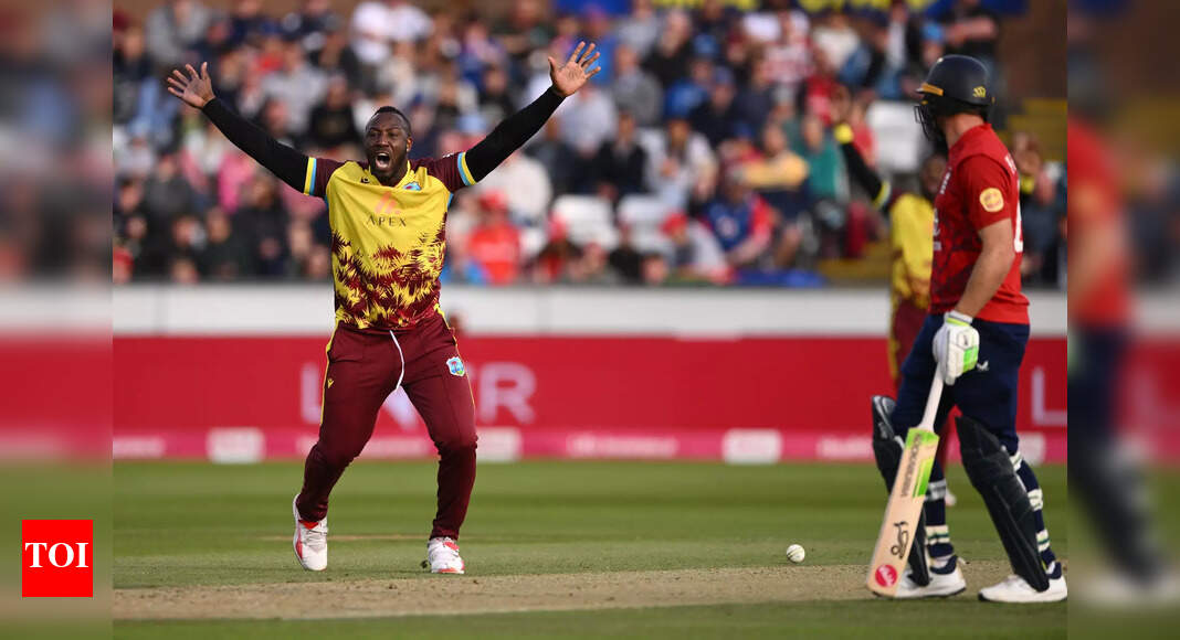 West indies all-rounder Andre Russell appeals with success for the wicket of Tom Banton after review during an IT20 between…