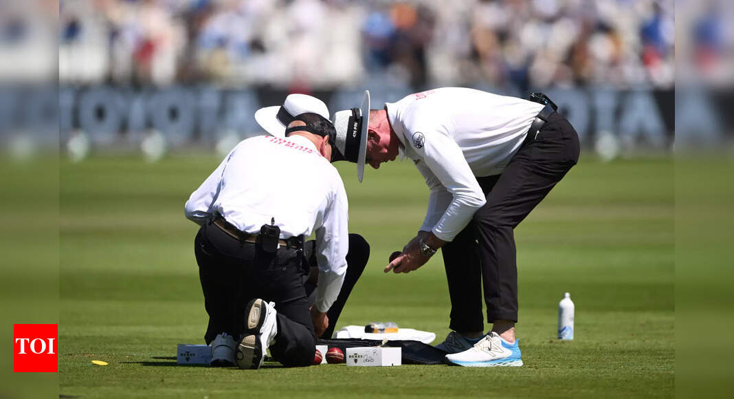 Umpire Paul Reiffel (R) checks a box of balls before making a change during day three of the Third Test…