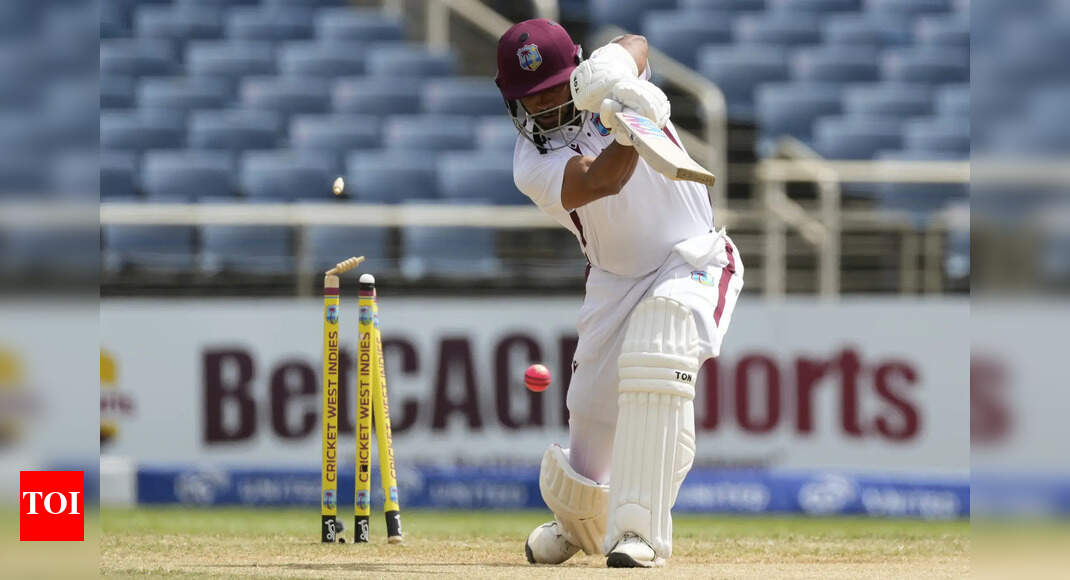 West Indies’ Brandon King is bowled by Australia’s Mitchell Starc on day three of the third Test cricket match at…