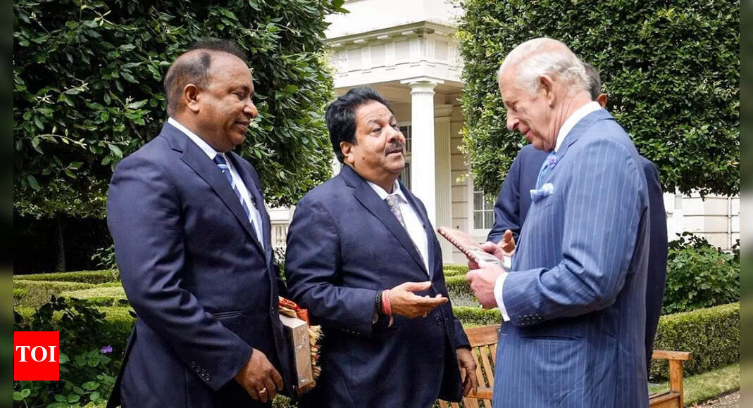 BCCI Vice President (C) Rajeev Shukla presents his book on partition to King Charles III in London. (Image: X) Indian…