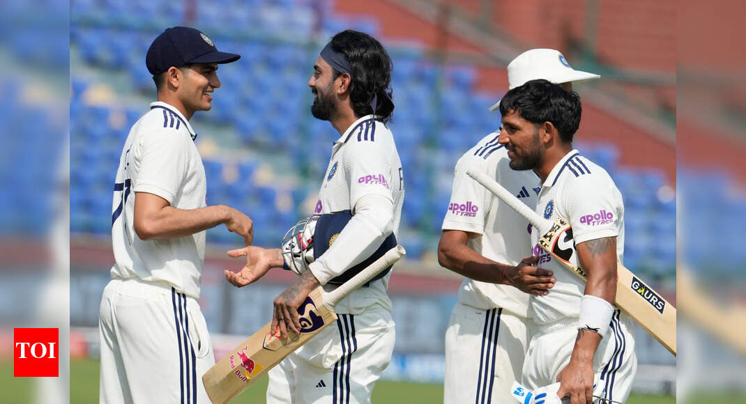 India’s captain Shubman Gill congratulates teammate KL Rahul and wicketkeeper Dhruv Jurel on wining the second cricket test match between…