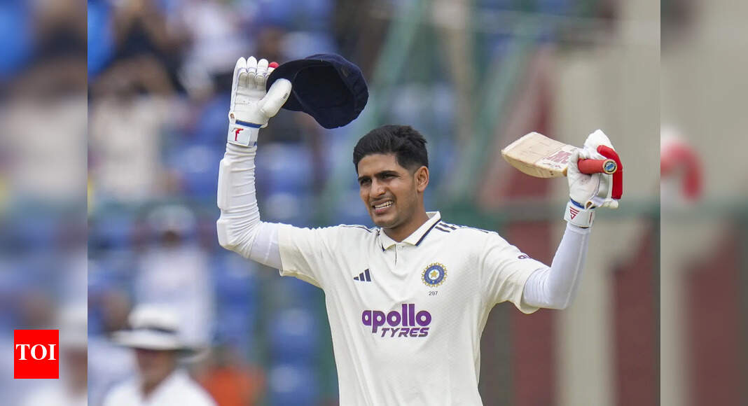 New Delhi: India’s captain Shubman Gill celebrates his century on day two of the second and final Test cricket match…