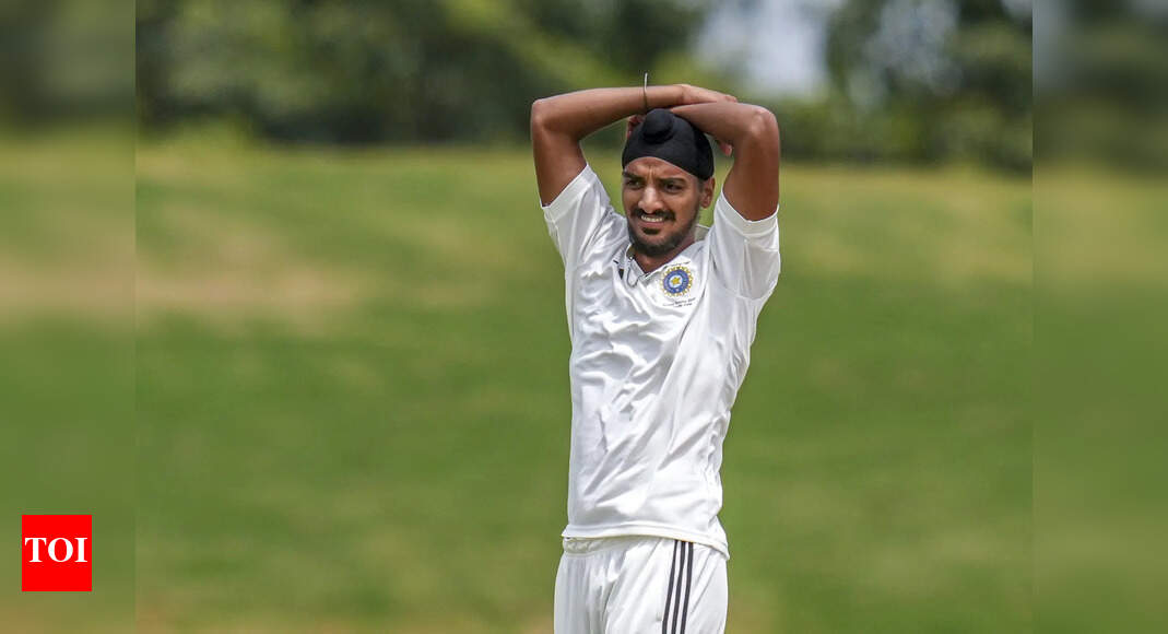 Bengaluru: North Zone’s Arshdeep Singh reacts during the second day of the Duleep Trophy 2025 quarter-final cricket match between East…
