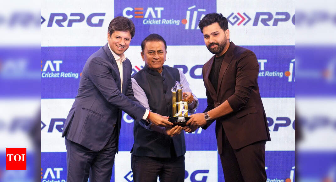Mumbai: Former Indian cricketer Sunil Gavaskar, center, presents a Memento for Winning Champions Trophy 2025 to cricketer Rohit Sharma, right,…