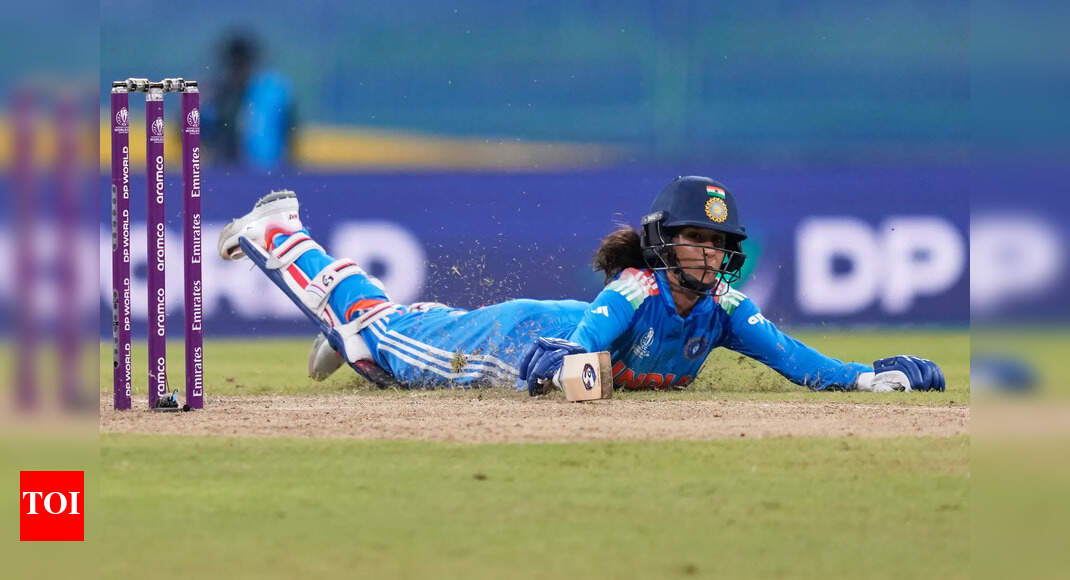 India’s Jemimah Rodrigues dives into her creese during the ICC Women’s Cricket World Cup match between India and Pakistan at…