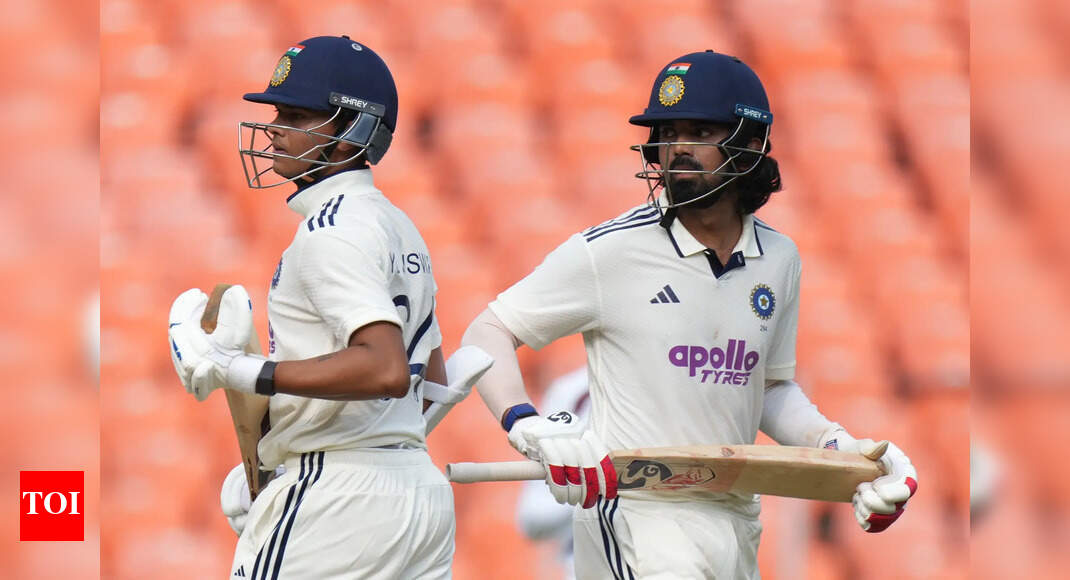 India’s KL Rahul, right, and Yashasvi Jaiswal, center, run between the wickets to score on the first day of the…