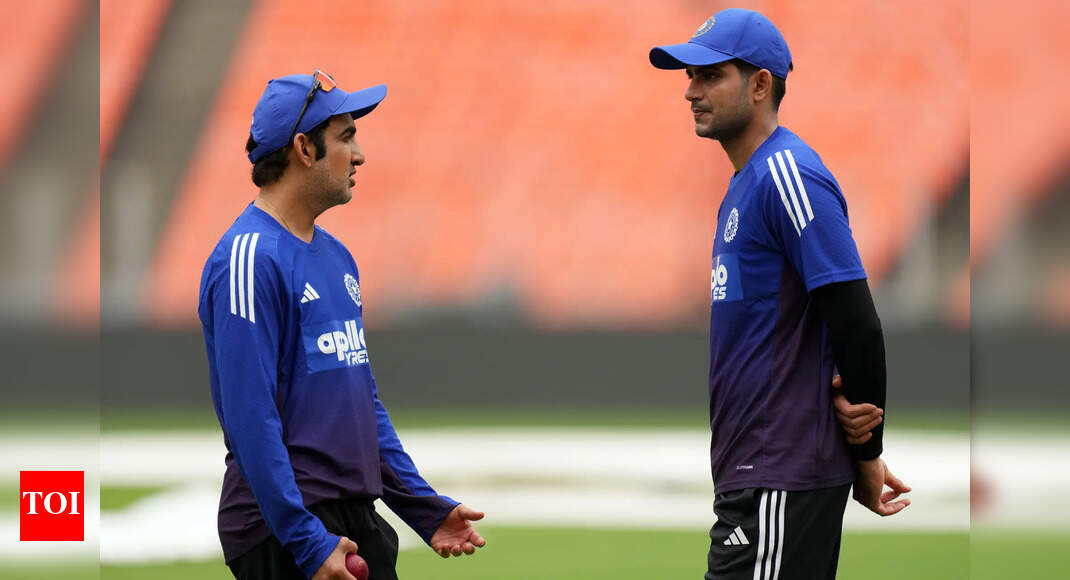 India’s head coach Gautam Gambhir, left, and India’s captain Shubman Gill talk during a practice session ahead of the first…