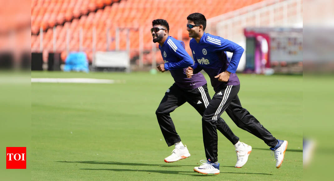 India’s captain Shubman Gill, right, and Mohammed Siraj warm up during a practice session ahead of the first Test cricket…