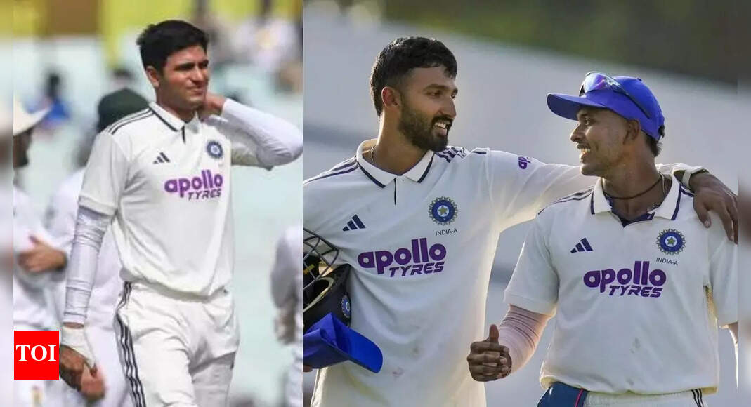 Shubman Gill (left), Devdutt Padikkal and Sai Sudarshan during the first day of the 1st unofficial test cricket match between…