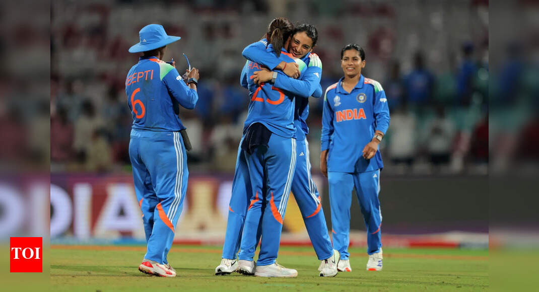 Smriti Mandhana celebrates with teammate Harmanpreet Kaur following victory in the ICC Women’s Cricket World Cup India 2025 match between…