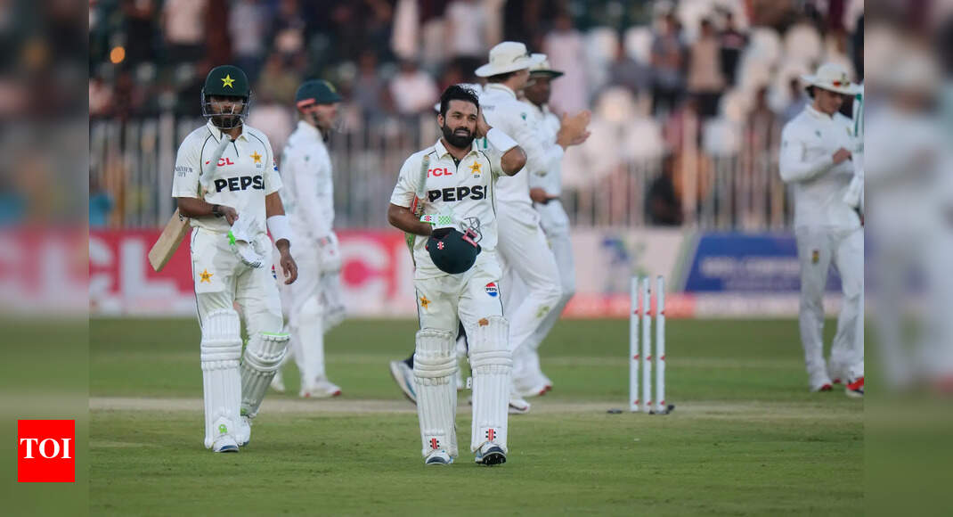 Pakistan’s Babar Azam and Mohammad Rizwan walk off the field on the end of the play of third day of…