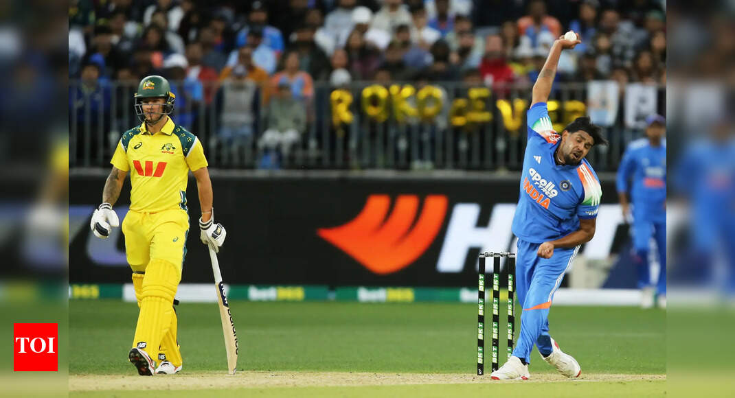 India’s Harshit Rana bowls during the one day international cricket match between Australia and India in Perth Australia, Sunday, Oct.…