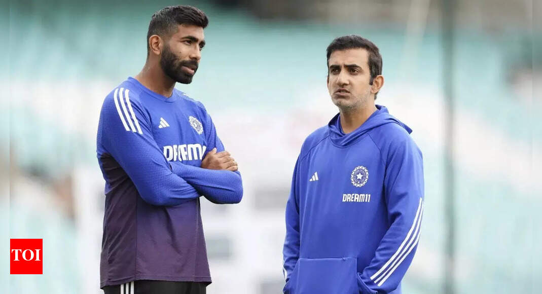 India bowler Jasprit Bumrah (L) with India coach Gautam Gambhir (R) ahead of the fifth Test between India and England…