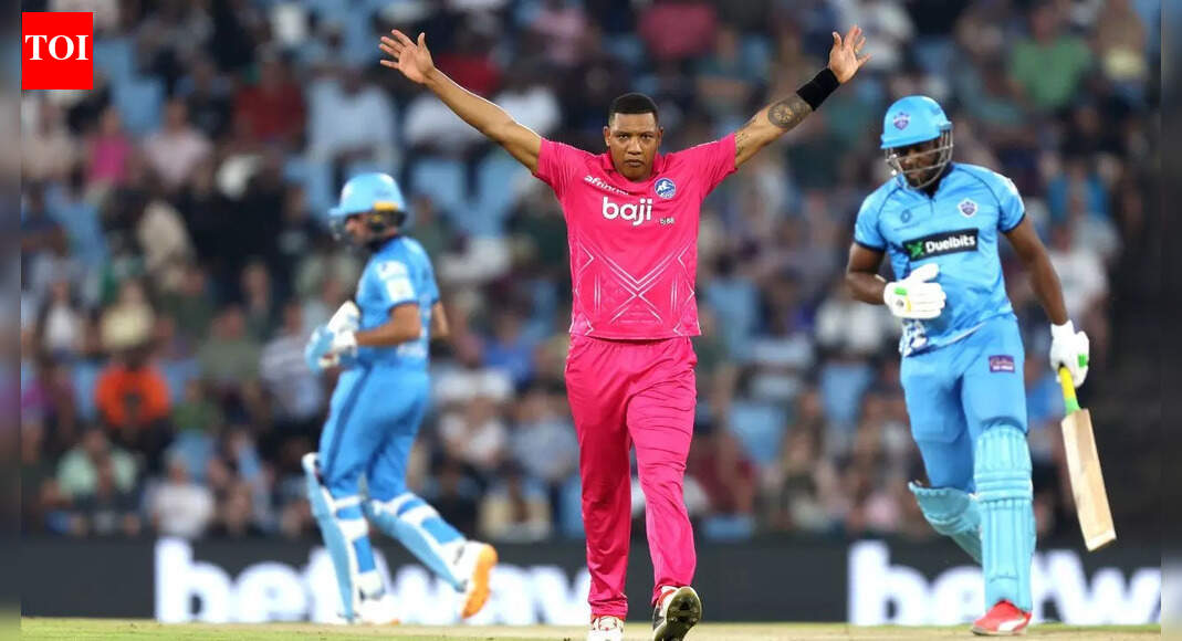 Ottneil Baartman of Paarl Royals celebrates the wicket of Andre Russell of Pretoria Capitals during match 25 of the Betway…
