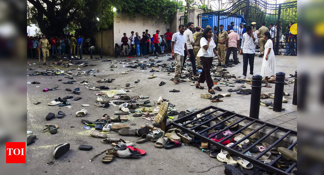 Footwears lie on the ground outside the Chinnaswamy Stadium following a stampede. (PTI Photo) NEW DELHI: In the aftermath of…