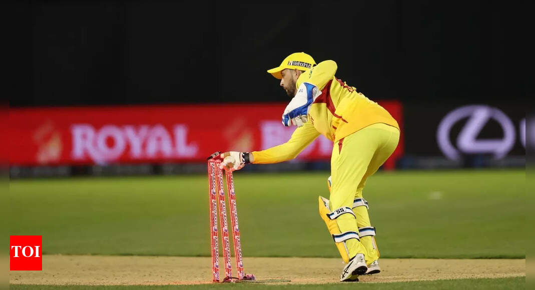 Devon Conway takes off the bails to dismiss Trent Boult in the match between Texas Super Kings and MI New…