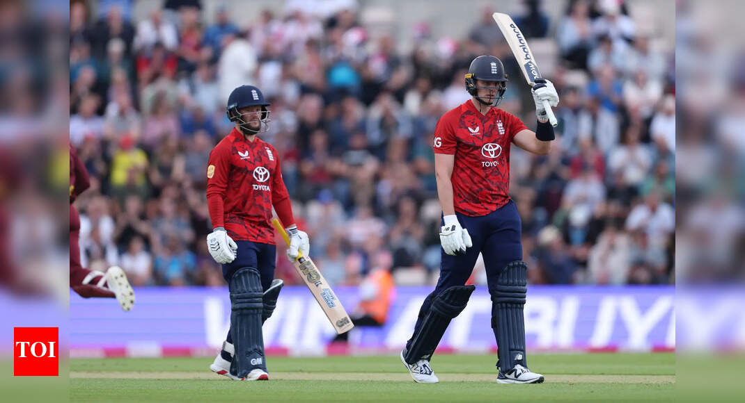 Jamie Smith (R) of England raises his bat after reaching his fifty as Ben Duckett looks on. (Photo by Michael…