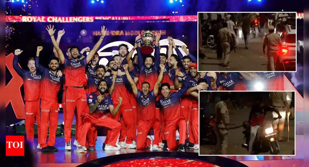 RCB title celebrations in Bengaluru turned chaotic as police used lathis on fans in celebration (Image via X/@ANI & IPL)…